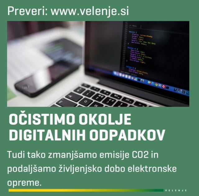 Tudi Mestna občina Velenje se pridružila vseslovenski akciji čiščenja digitalnih podatkov v okviru akcije Očistimo Slovenijo. V javni upravi bomo akcijo izvajali do 25. aprila, pozivamo pa tudi vse občanke in občane, da se nam pri tem pridružijo in s čiščenjem odvečnih gigabajtov okolje skupaj razbremenimo digitalnih odpadkov. Z enostavnim ukrepom lahko zmanjšamo emisije CO2 ter podaljšamo življenjsko dobo elektronske opreme.