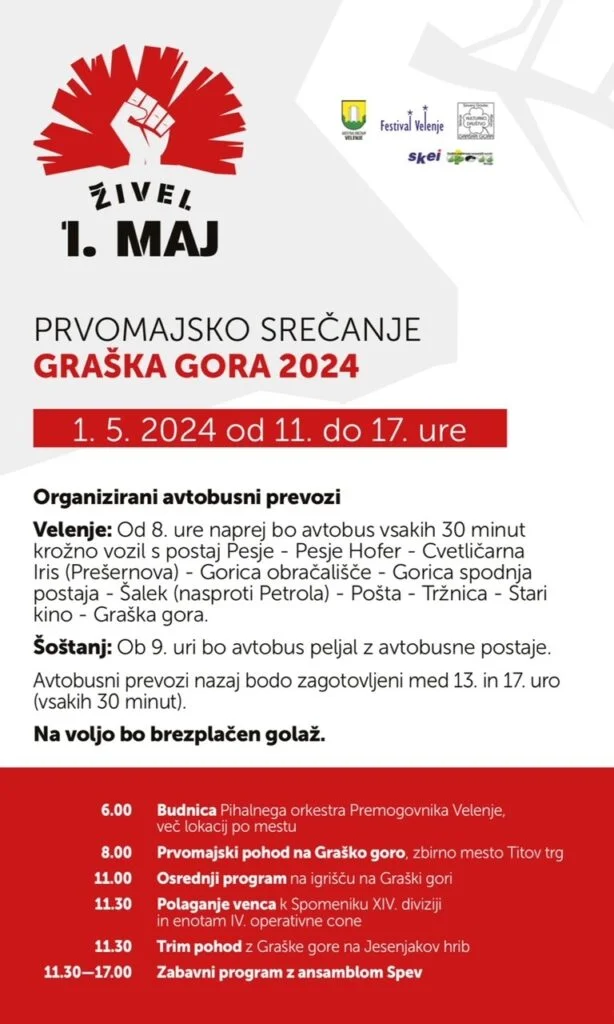 Tradicionalno prvomajsko srečanje na Graški gori že vrsto let simbolno poveže vse generacije v prijetnem druženju in izkazovanju pripadnosti plemenitim vrednotam dela, solidarnosti in pravičnosti. V programu bodo sodelovali sodelovali Pihalni orkester Premogovnika Velenje, Moški pevski zbor Kajuh Velenje in Ansambel Spev. Slavnostni govornik bo župan Mestne občine Velenje Peter Dermol. Slavnostni nagovor v imenu sindikatov pa bo imela tudi predsednica Zveze svobodnih sindikatov Slovenije Lidija Jerkič.