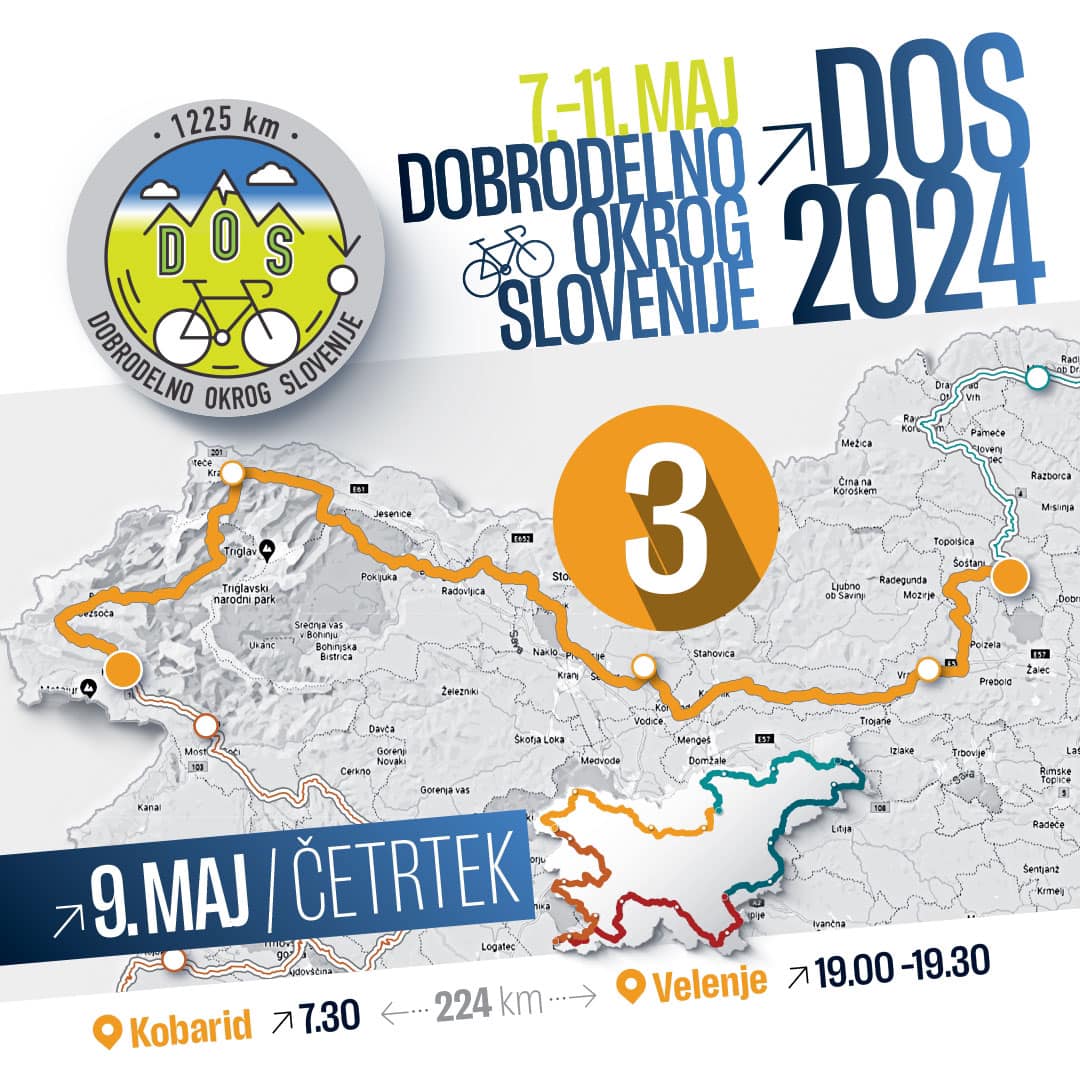 Približno 40 kolesarjev bo v Velenje prispelo v sklopu 3. etape iz Kobarida, kjer bodo startali ob 7.30 in po 224 kilometrov dolgi etapi in 3.046 višinskih metrih jih na cilju v Velenju pričakujemo v četrtek, 9. maja, med 19. in 19.30. Tretja etapa poteka po trasi: Soča, Trenta, Vršič, Kranjska Gora, Jesenice, Bled, Cerklje na Gorenjskem, Komenda, Dob, Vransko, Polzela, Velenje. V petek, 10. maja, bodo v Velenju ob 7.30 startali četrto etapo proti Graški gori na Koroško in naprej s ciljem v Moravskih Toplicah.