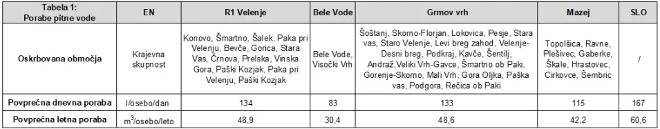 Še informacija o ceni pitne vode: Cena 1 m3 vode je 1,0631 EUR (z 9,5 % DDV). Povprečna poraba pitne vode v Sloveniji znaša 167 l/osebo/dan oz. 60,6 m3/osebo/leto. Podatki o porabah vode za oskrbovalna območja v Šaleški dolini so predstavljeni v Tabeli 1. Uporabniki lahko mesečne porabe vode za svoje gospodinjstvo najdejo na položnicah ali v Portalu za uporabnike na spletni strani podjetja.