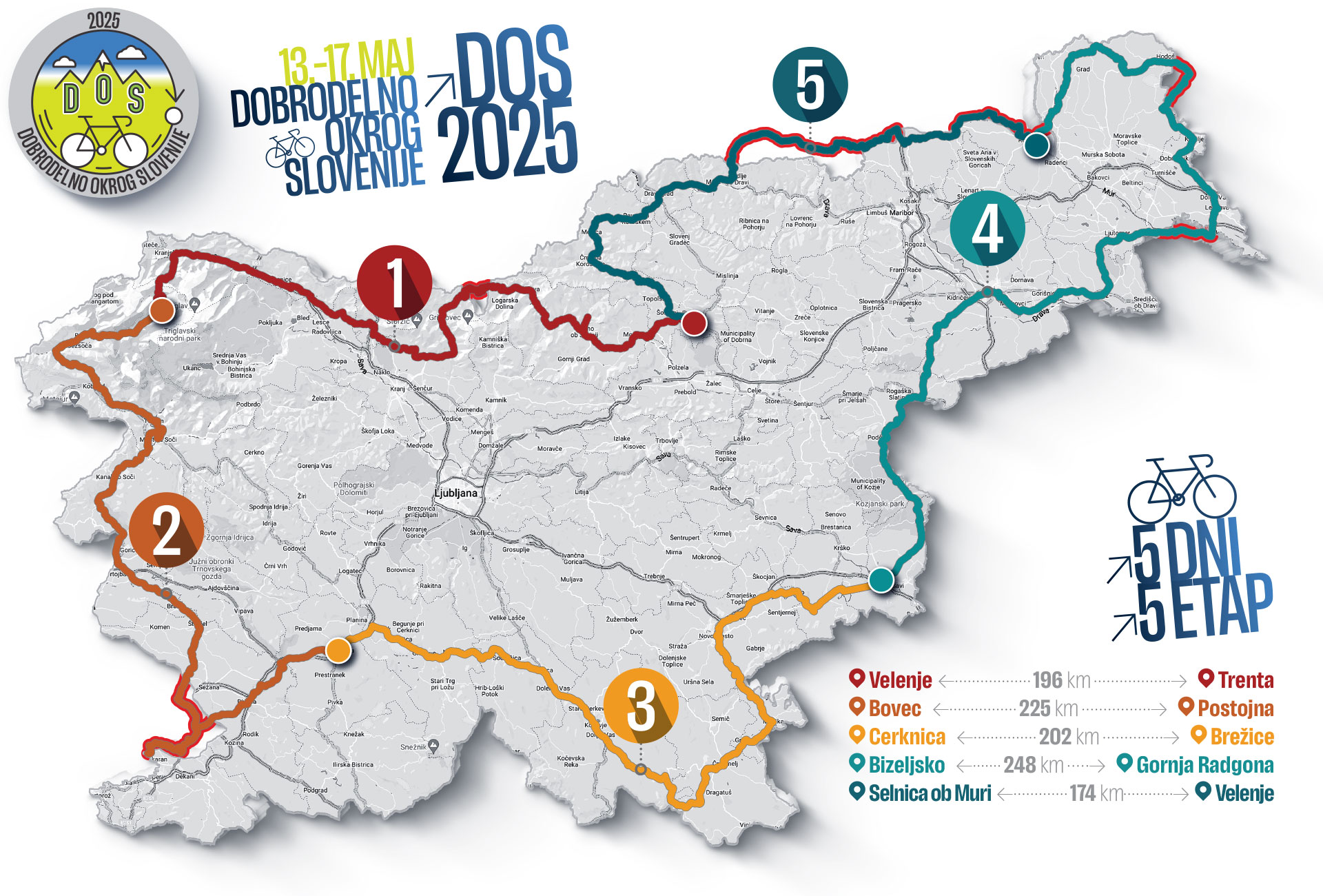Petdnevna kolesarska preizkušnja se bo začela v torek, 13. maja, ko bodo kolesarji ob 7. uri zjutraj iz Velenja odkolesarili proti Kobaridu, kjer se bo končala prva etapa. Naslednji dan, v sredo, 14. maja, bodo nadaljevali s potjo od Kobarida do Postojne. V četrtek, 15. maja, jih čaka trasa od Postojne do Brežic, v petek, 16. maja, pa bodo prekolesarili pot od Brežic prek Gornje Radgone do Polane pri Murski Soboti. Zadnja, peta etapa, bo potekala v soboto, 17. maja, ko se bodo iz Polane ponovno vrnili nazaj v Velenje, kjer se bo kolesarska zgodba letošnjega DOS zaključila predvidoma ob 18.15.