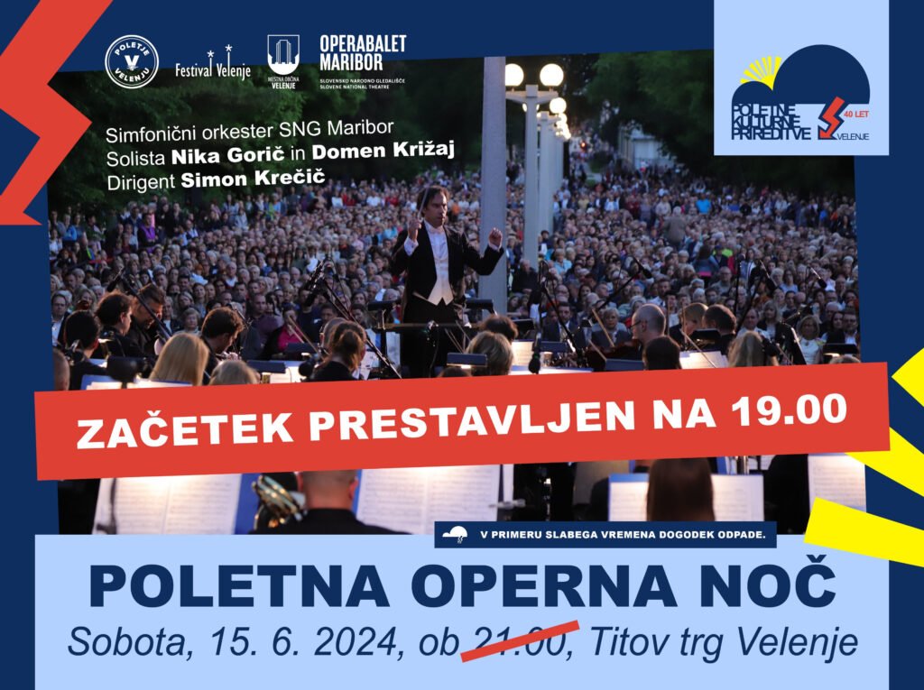 Spoštovani, obveščamo vas, da se bo sobotni koncert (15. junij 2024) POLETNA OPERNA NOČ v izvedbi SNG OPERE MARIBOR na željo nastopajočih zaradi nizkih večernih temperatur ZAČEL OB 19. URI […]