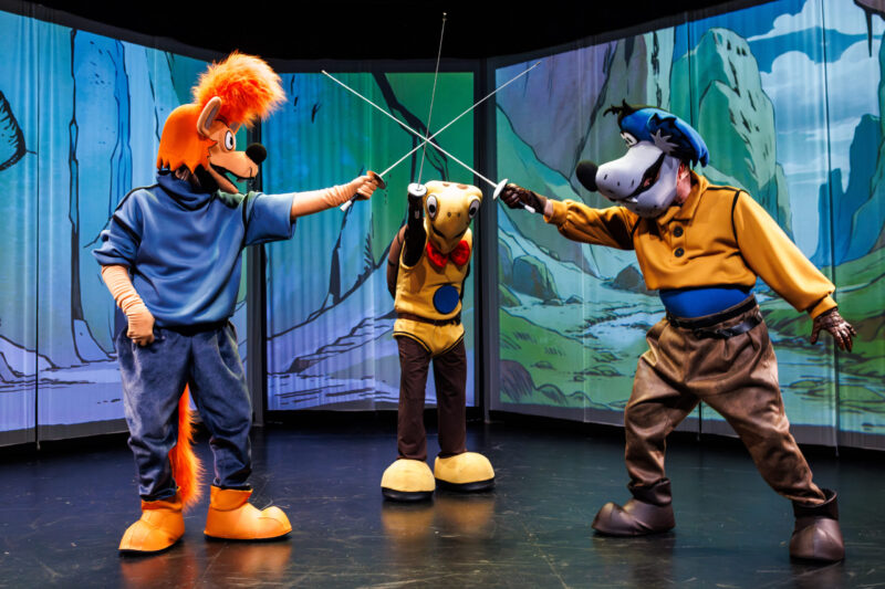 Lisjak Zvitorepec, želvak Trdonja, in volk Lakotnik na oder stopajo naravnost iz stripa znamenitega Mikija Mustra – v letu 2025 obeležujemo stoletnico njegovega rojstva. Ob tej priložnosti so se mu poklonili tudi v Slovenskem mladinskem gledališču in ga v igrani predstavi predstavili mlajšemu občinstvu.