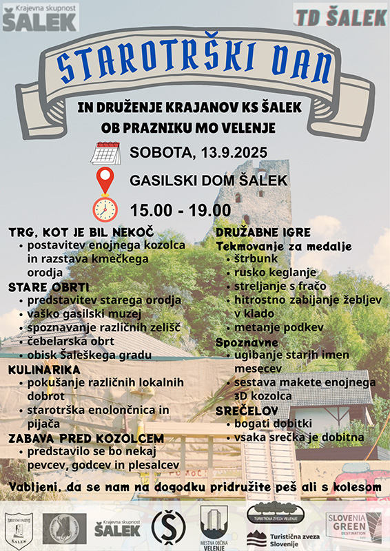 Starotrški dan v Šaleku je v soboto, 13. septembra 2025, od 14.00 do 20.00 pred gasilskim domom Šalek.