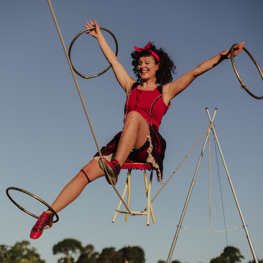 Brez veliko besed ta kodrasta klovnesa sporoči ogromno — s pomočjo cirkuških veščin, kot so hoja po napeti vrvi, tango ples, manipulacija s klobukom, stoja na rokah, klovnovstvo in hula hoop.