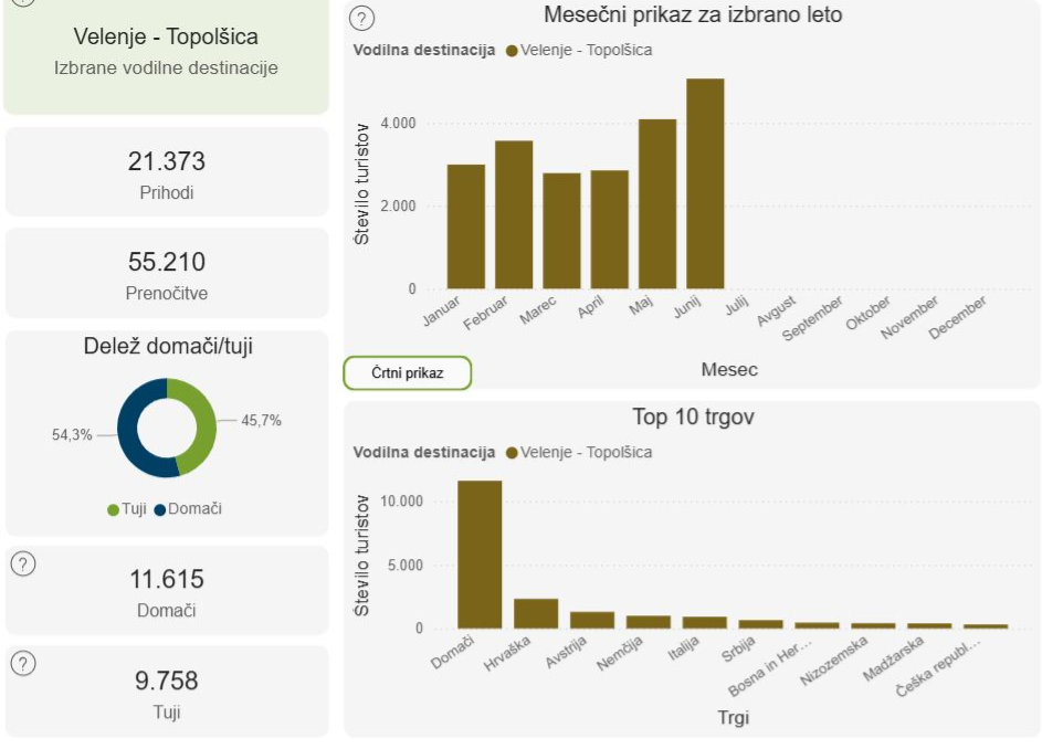 | Po podatkih Nacionalnega informacijskega središča za turizem (NIS) se je turistični obisk v Šaleški (Velenje, Šoštanj) v prvi polovici leta 2025 povečal. Skupno sta občini Velenje in Šoštanj zabeležili 21.373 prihodov in 55.210 prenočitev, kar pomeni 33,1 odstotka več prihodov in 35,5 odstotka več prenočitev v primerjavi z enakim obdobjem leta 2024. Povprečna doba bivanja je bila 2,6 dneva.Struktura gostov kaže, da je bilo več kot polovica domačih – natančneje 54,3 odstotka, medtem ko je bilo tujih gostov 45,7 odstotka.Najpogostejši tuji trgi so bili Hrvaška, Avstrija, Nemčija, Italija in Srbija, kar potrjuje stalno zanimanje bližnjih evropskih držav za območje Šaleške. |