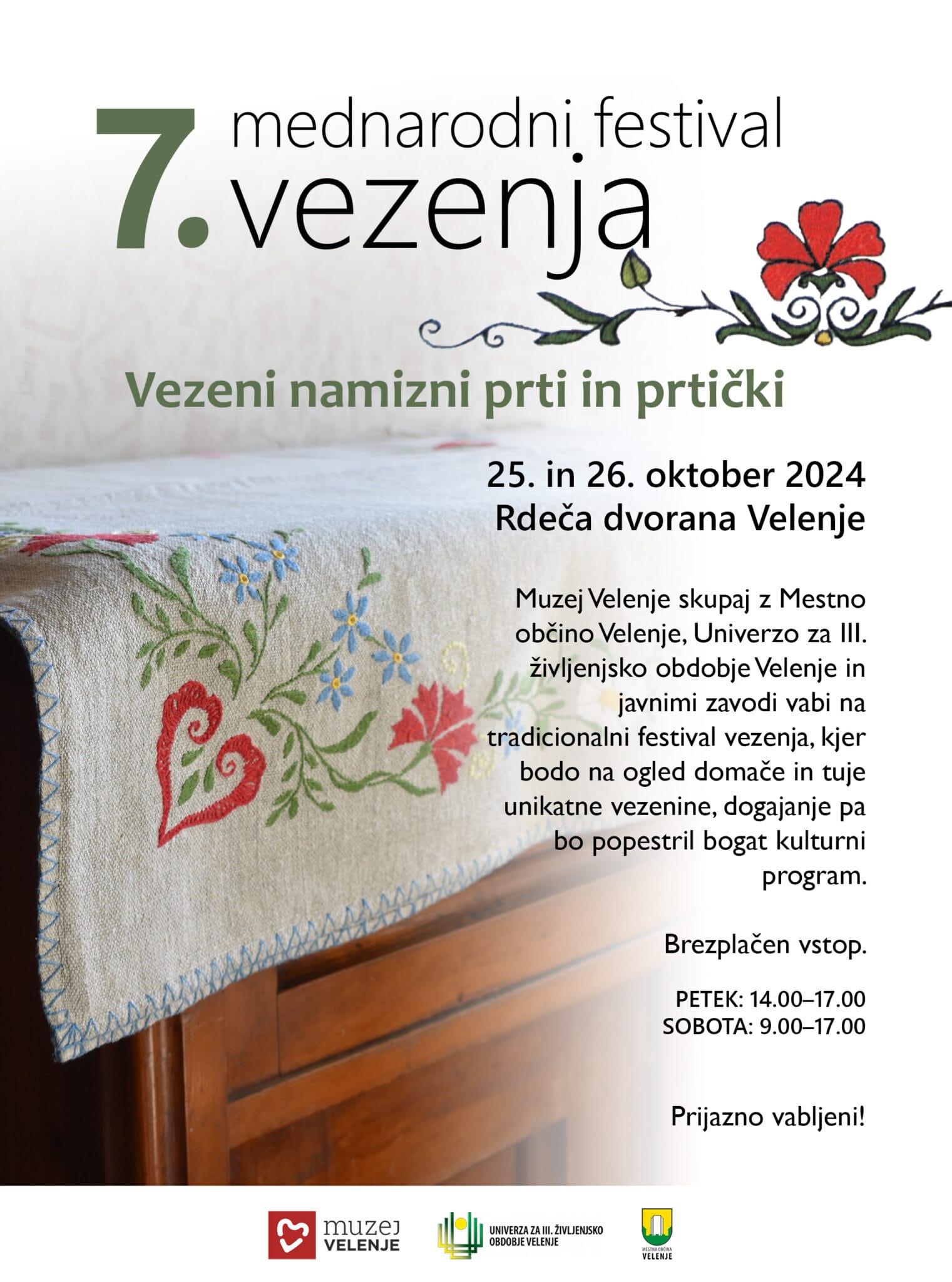 V petek in soboto, 25. in 26. oktobra, bo v Rdeči dvorani Velenje potekal 7. mednarodni festival vezenja. Dogodek pripravlja Muzej Velenje skupaj z Mestno občino Velenje, Univerzo za III. življenjsko obdobje Velenje in številnimi velenjskimi javnimi zavodi. Dogodek, ki ima v Velenju že dolgo tradicijo, bo postavil na ogled domače in tuje unikatne vezenine, dogajanje pa bo popestril bogat kulturni program. Tema letošnjega festivala so vezeni namizni prti in prtički.