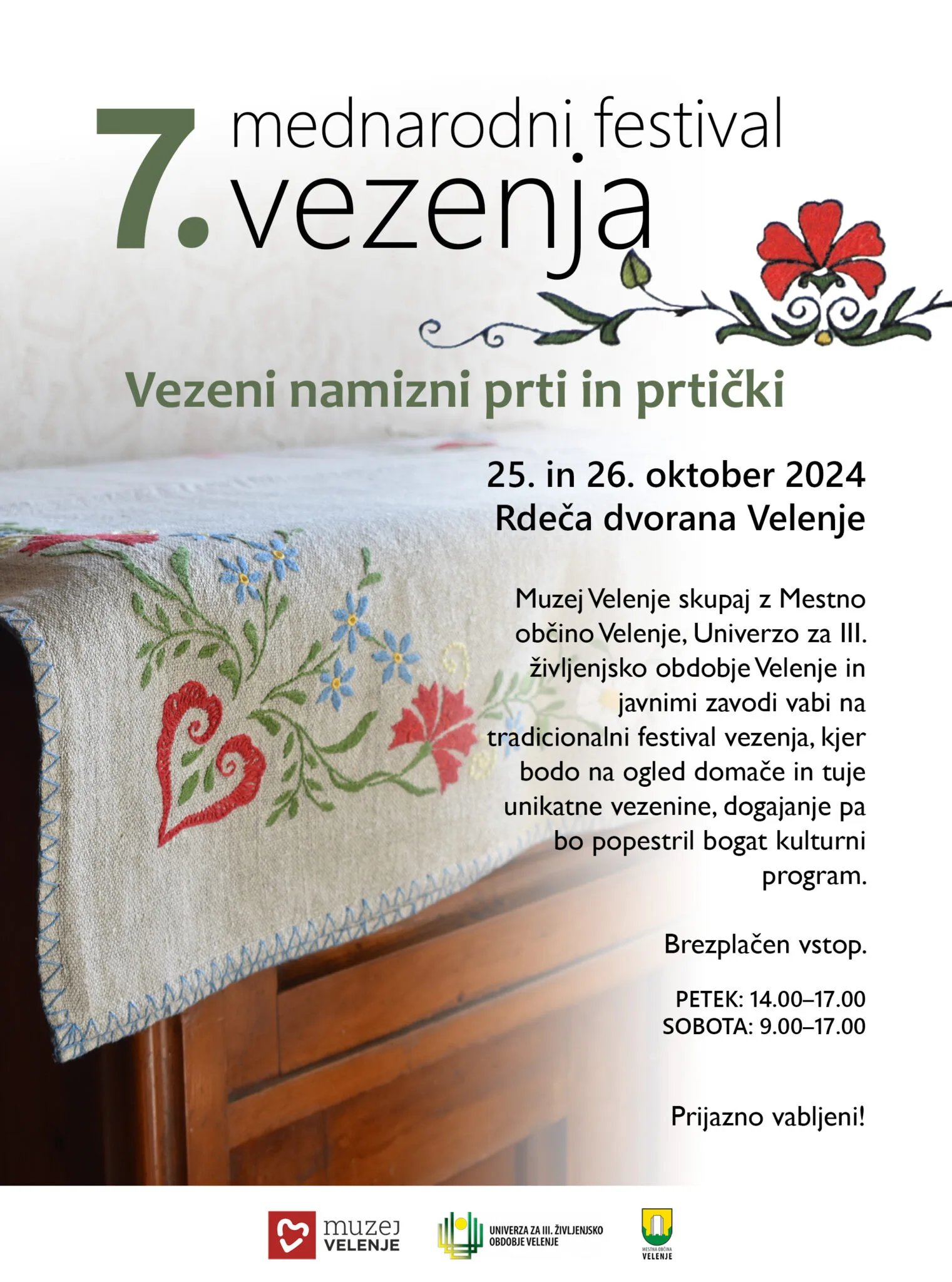 V petek in soboto, 25. in 26. oktobra, bo v Rdeči dvorani Velenje potekal 7. mednarodni festival vezenja. Dogodek pripravlja Muzej Velenje skupaj z Mestno občino Velenje, Univerzo za III. življenjsko obdobje Velenje in številnimi velenjskimi javnimi zavodi. Dogodek, ki ima v Velenju že dolgo tradicijo, bo postavil na ogled domače in tuje unikatne vezenine, dogajanje pa bo popestril bogat kulturni program. Tema letošnjega festivala so vezeni namizni prti in prtički.