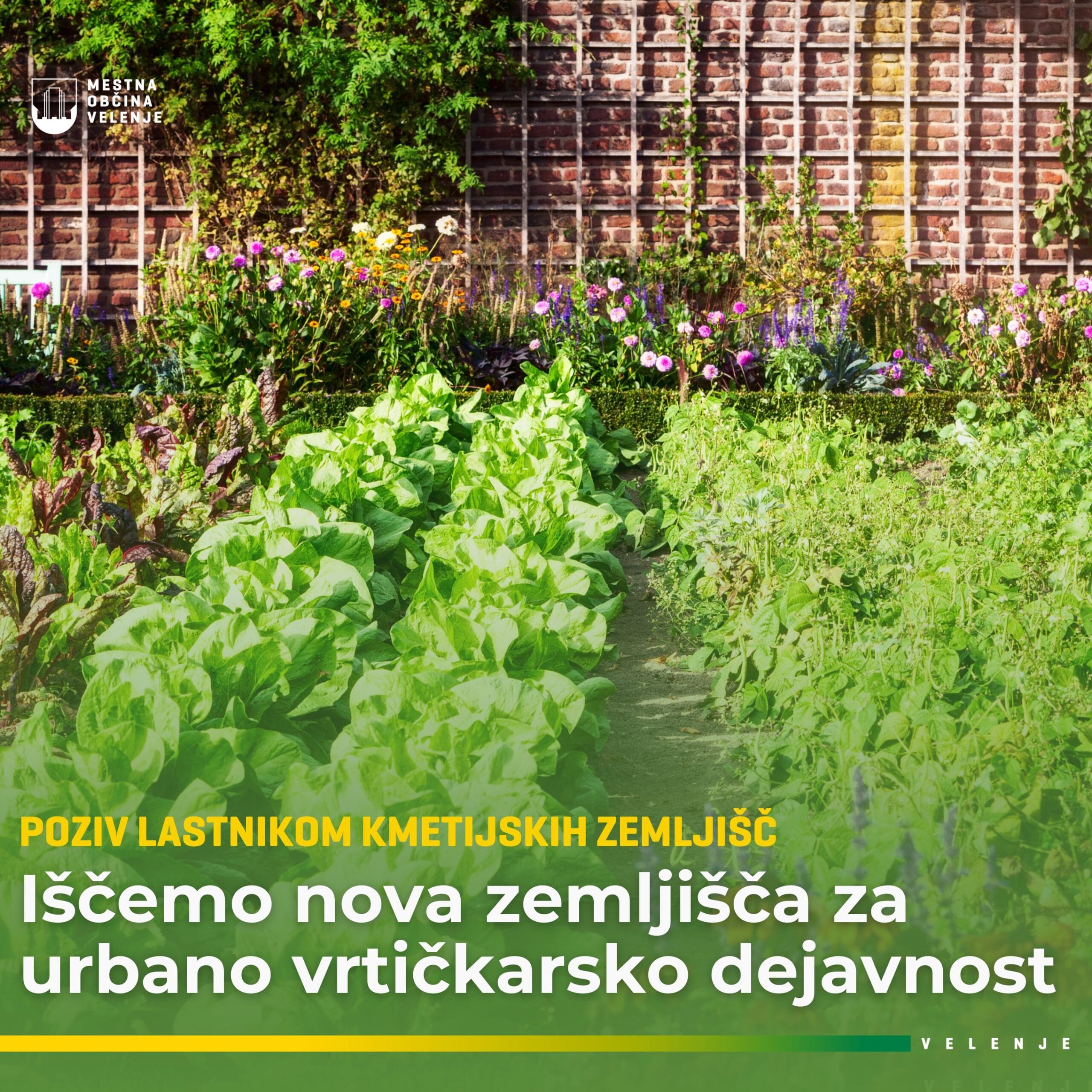 V Mestni občini Velenje že več kot 15 let skrbimo za zagotavljanje občinskih vrtičkov, s čimer našim občanom omogočamo kakovostno vrtičkarsko dejavnost. Trenutno imamo v občini urejeno območje vrtičkov Krajnca v Bevčah, kjer je urejenih 81 vrtičkov. Zaradi širitve poslovnih con in gradnje hitre ceste tretje razvojne osi se postopoma opuščajo vrtički v Stari vasi in ob železnici. Zanimanje za nove vrtičke narašča, zato si prizadevamo zagotoviti dodatne površine za to dejavnost. Ker nimamo več na voljo primernih zemljišč za ureditev novih vrtičkov, se s tem javnim pozivom obračamo na vse lastnike kmetijskih zemljišč v bližini mesta, ki bi bili pripravljeni prodati ali oddati zemljišče v najem občini za ureditev novih vrtičkov za naše občane.