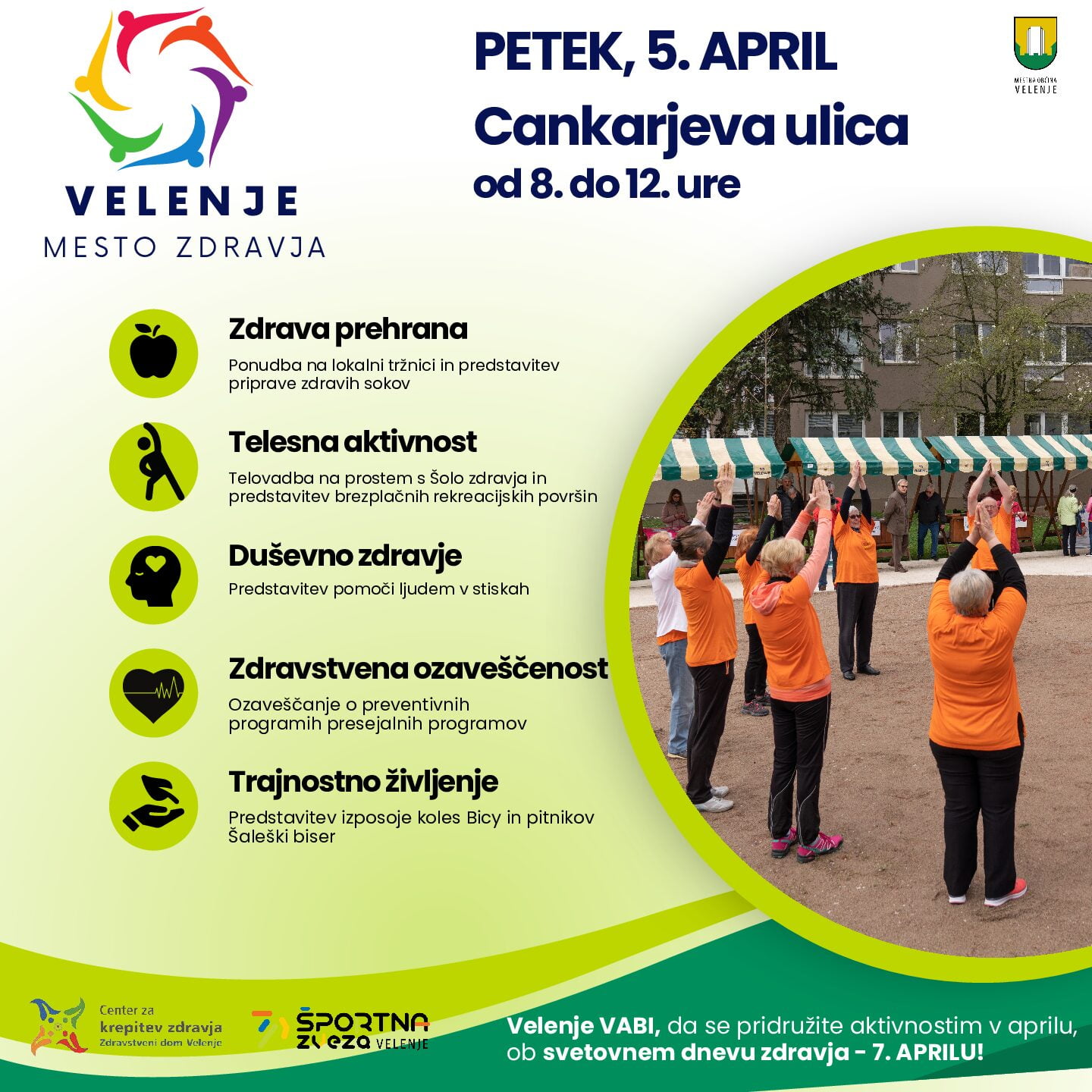 Ob 8.30 vabimo na skupinsko telovadbo z velenjsko podružnico Šole zdravja, ob 9.30 bo na Cankarjevi ulici prisotne nagovorila podžupanja Mestne občine Velenje Darinka Mravljak. Brezplačna svetovanja, meritve in koristne nasvete bo strokovno osebje podajalo od 8. do 12. ure. Prijazno vabljeni ta petek dopoldan na Cankarjevo! April, mesec zdravja, pa zaključimo 1. maja s skupinskim pohodom na Graško goro.