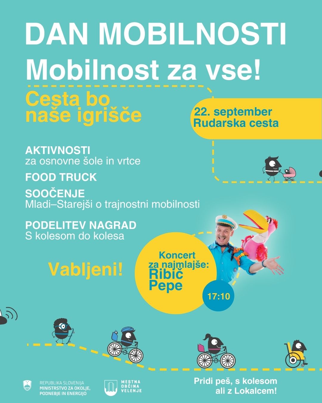 Popoldne bomo na Rudarski cesti gostili Soočenje med mladimi in starejšimi, kjer bomo skupaj razmišljali o bolj dostopni, vključujoči in trajnostni mobilnosti v prihodnosti. Ob 17. uri pa vse družine, otroke in ljubitelje dobre glasbe vabimo na veliki koncert Ribiča Pepeta, ki bo s petjem in zabavo poskrbel za nepozaben zaključek dneva brez avtomobila. Na zaključni prireditvi bomo razglasili tudi nagrajence akcije S kolesom do kolesa. Glavna nagrada bo novo gorsko kolo, podeljeno prav na odru zaprte Rudarske ceste.