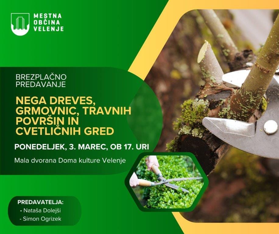 Z namenom ozaveščanja o pravilni negi drevnin, grmovnic in zelenih površin bomo v ponedeljek, 3. marca 2025, ob 17. uri v mali dvorani Doma kulture Velenje organizirali brezplačno predavanje. Dogodek je namenjen predvsem lastnikom individualnih hiš, etažnim lastnikom in drugim zainteresiranim posameznikom, saj za urejanje drevnine, grmovnic in zelenih površin na javnih površinah skrbi koncesionar. Predavatelja mag. Nataša Dolejši, univerzitetna diplomirana inženirka agronomije, in Simon Ogrizek, diplomirani inženir agronomije in hortikulture, bosta spregovorila o negi grmovnic, travnih površin, nasadov gred s sezonskim cvetjem in zeliščnih trajnic.