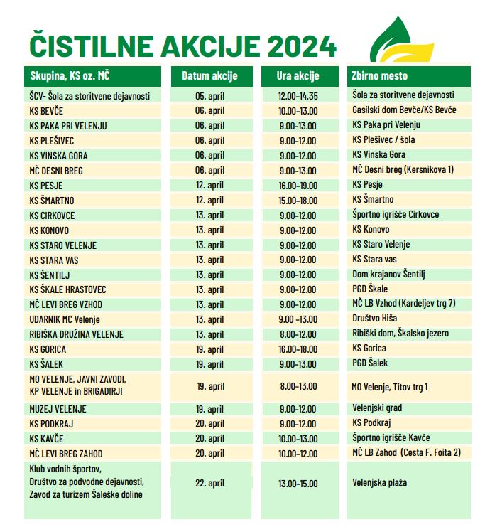 Vsako leto številni prostovoljci, po katerih je naša občina poznana, sodelujejo v čistilnih akcijah. Čistilne akcije bodo potekale od 6. aprila, ko zaznamujemo dan za spremembe, pa vse do 22. aprila, ko je svetovni dan Zemlje. K sodelovanju vabimo vse občanke in občane, da se pridružijo akciji na območju, kjer imajo dom ali preživljajo prosti čas. Sodelovanje je prostovoljno, vsi udeleženci prejmejo zaščitne rokavice in vrečke za odpadke. Razpored je objavljen v priloženi tabeli. Zbirno mesto je pred sedeži vseh krajevnih skupnosti, mestnih četrti oz. kot je navedeno v tabeli. Zbrani odpadki se odlagajo v kesone na lokaciji zbirnega mesta in bodo kasneje odpeljani v Zbirni center Velenje ob Škalskem jezeru. Člani lovskih družin, gasilskih društev, športne organizacije, taborniki in druge zainteresirane organizacije ali podjetja naj se čistilni akciji pridružijo na območju, kjer delujejo oz. imajo sedež, prostore. Zaposleni na Mestni občini Velenje, javnih zavodih in Komunalnem podjetju Velenje bodo čistili mestne vpadnice v petek, 19. aprila, dopoldan. Zbirno mesto je ob 8. uri na parkirišču za občino. Pridružili se jim bodo tudi udarniki in drugi prostovoljci. Spomladansko čiščenje bomo zaključili s čistilno akcijo na Velenjski plaži, ki bo potekala v ponedeljek, 22. aprila, ob pomoči članov iz Kluba vodnih športov Velenje, Zavoda za turizem Šaleške doline in ob pomoči potapljačev iz Društva za podvodne dejavnosti Velenje.