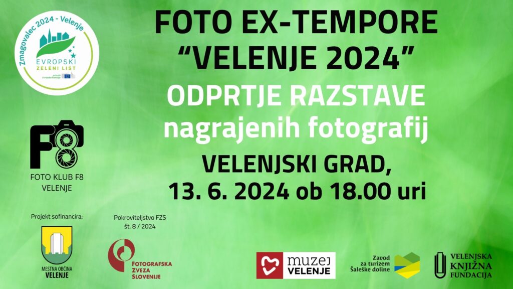 V četrtek, 13. junija, Muzej Velenje vabi na Velenjski grad na odprtje razstave najboljših fotografij natečaja Foto EX-tempore »Velenje 2024«, ki ga je pripravil velenjski Foto kluba F8. Natečaj je potekal pod pokroviteljstvom Fotografske zveze Slovenije. Na odprtju v grajskem atriju bodo podelili nagrade in priznanja. V kulturnem programu bo sodelovala Tija Pesjak, učenka Glasbene šola Fran Korun Koželjski Velenje.