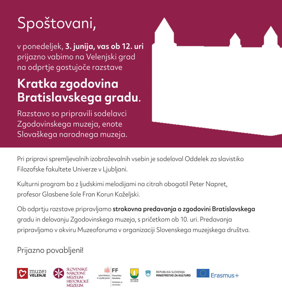 V ponedeljek, 3. junija, se bo na Velenjskem gradu odvijal Muzeoforum, strokovno srečanje slovenski muzealcev v organizaciji Slovenskega muzejskega društva. V okviru Muzeoforuma bodo odprli tudi gostujočo razstavo Slovaškega narodnega muzeja – Zgodovinskega muzeja z naslovom Kratka zgodovina Bratislavskega gradu.