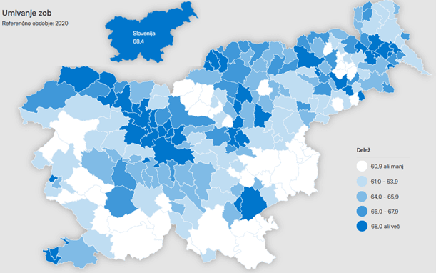 Karta prikazuje delež oseb, ki si vsaj dvakrat dnevno umivajo zobe, po slovenskih občinah v letu 2020. V Sloveniji si je leta 2020 najmanj dvakrat dnevno umivalo zobe 68,4 % oseb. Več o podobnih podatkih si lahko preberete na: http://obcine.nijz.si/