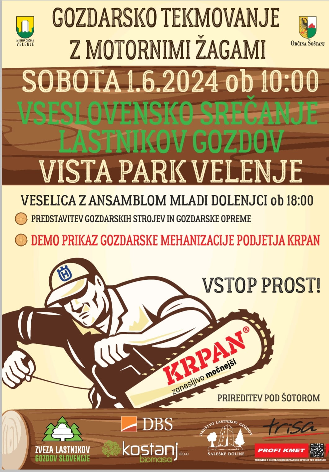SREČANJE LASTNIKOV GOZDOV SLOVENIJE IN SEKAŠKO TEKMOVANJE Z MOTORNO ŽAGO bo letos v soboto, 1. junija 2024, od 11. ure dalje, Vista park Velenje.