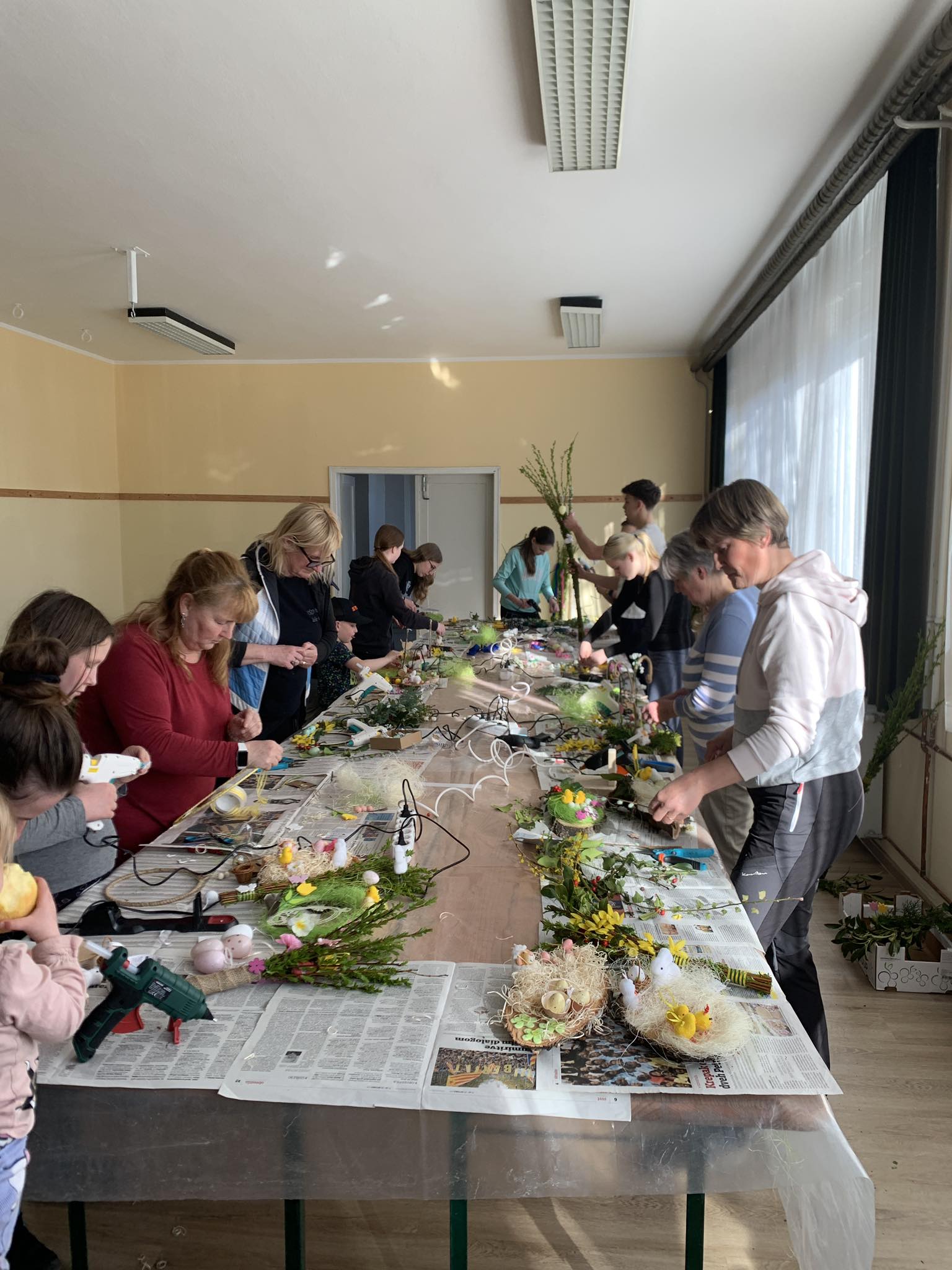 Delavnica je bila polna pisanega cvetja, trakov, zelenja, velikonočnega okrasja in dobre volje nas članov. Izdelali smo številne butare, ki nam jih je pripravil Grega Petkovnik, za njegovo delo in trud smo mu zelo hvaležni. Člani društva smo jih z veseljem okrasili s pisanimi trakovi in cvetjem. Naše domove bodo krasili veliki aranžmaji iz breze okrašeni z velikonočnimi okraski. Na vratih v naše domove, pa nas bo pozdravil pisani venec narejen z mislijo v prijazno pomlad.