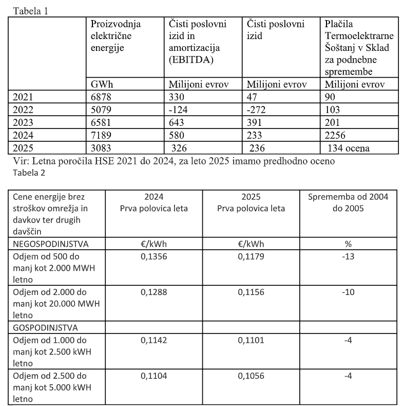 Rezultati v Tabeli 1 kažejo, da je proizvodnja električne energije v HSE zaradi te izločitve lani upadla